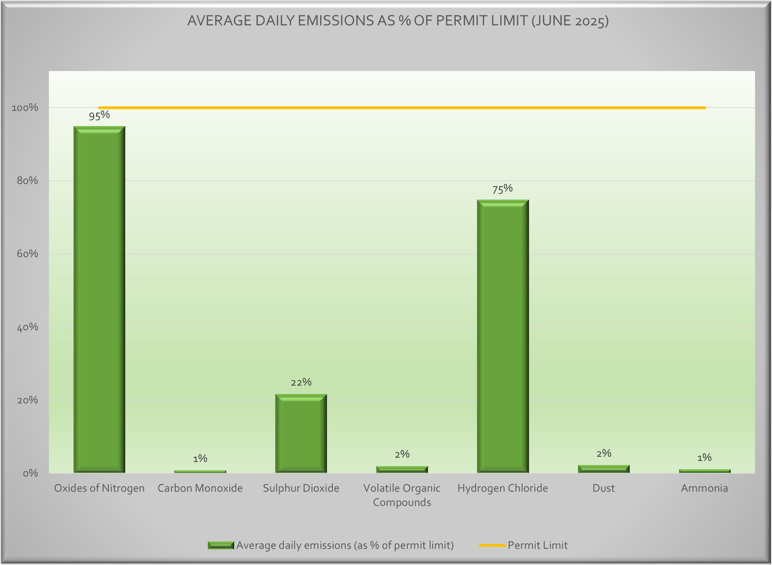 The graph shows the level of permissible emissions according to the Environmental Permit, shown by an orange line. The actual emissions produced by the facility are shown in green as a percentage average output over the month. For this month, all emissions produced are below the permitted limit set by the Environment Agency and our permit.
