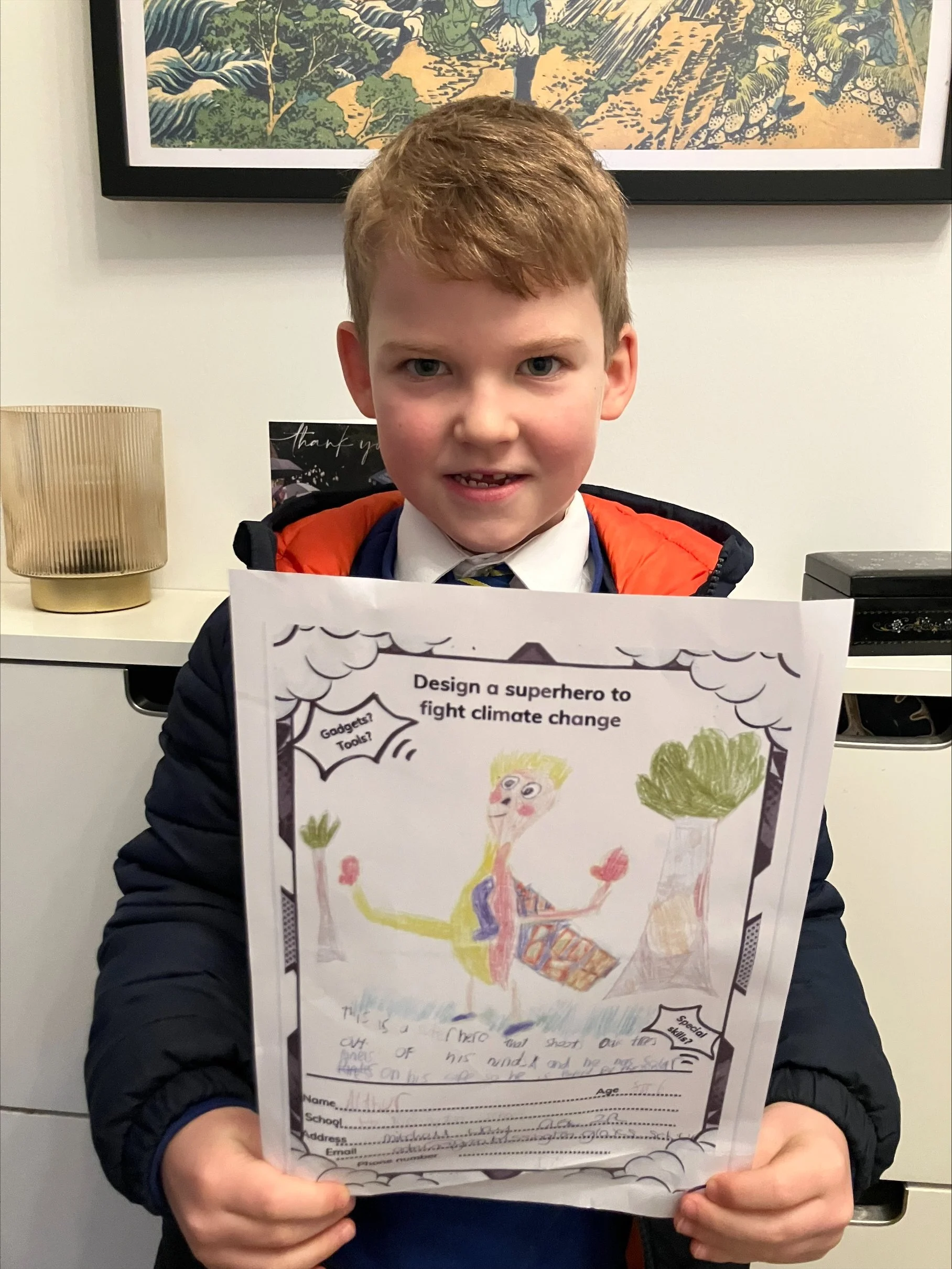Arthur was named winner of the 4-6 year old category producing a design of a superhero that can shoot oak trees out of his hands. His cape features solar panels, so his talents are powered by the sun.
